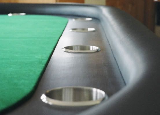 48X96" 2" raised rail Custom Suits inlays on side. Whisper Vinyl Nylon Velvet Speed Cloth 1" 65lb rail foam 1/4" 2EO volara for playing surface Swingout cupholders. ![]() Construction pic showing how i did the raised rail. (Pain in the ass) ![]() Close up of the suited inlay ![]() Not the best but gave me the confidence to try again, which I'm starting soon. |